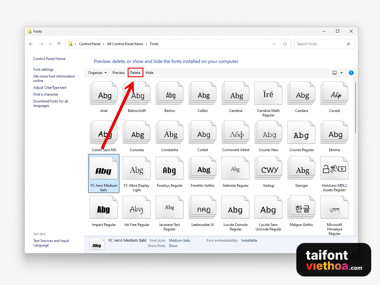 - Trên Windows: Mở thư mục C:\Windows\Fonts (hoặc vào Control Panel > Fonts như hướng dẫn trên). Tìm phông chữ bạn muốn xóa khỏi hệ thống, nhấp chuột phải và chọn Delete. Xác nhận Yes khi được hỏi. Ngay lập tức font đó sẽ bị gỡ khỏi máy tính. Lưu ý: không nên xóa các font mặc định hệ thống (như Tahoma, Arial, Times New Roman…) để tránh lỗi hiển thị giao diện.